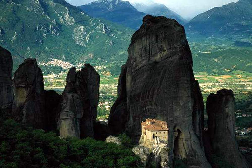 希腊中部地区有一派奇特的景观,数十座20~400米高低不等的柱形垂直岩石群拔地而起,建造在陡峭岩石顶上的24座修道院仿佛 悬浮在空中。虔诚的修道士们在此过着与世隔绝的戒律严格的修行生活,直到20世纪初修道院还是靠绳梯和吊车与外界相通。这些 修道院是14~16世纪为避免战乱和抵御土耳其人对基督教的迫害而建造的,目前仍有6座修道院在使用之中。